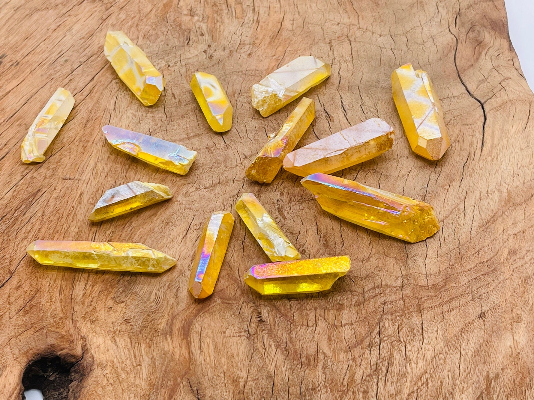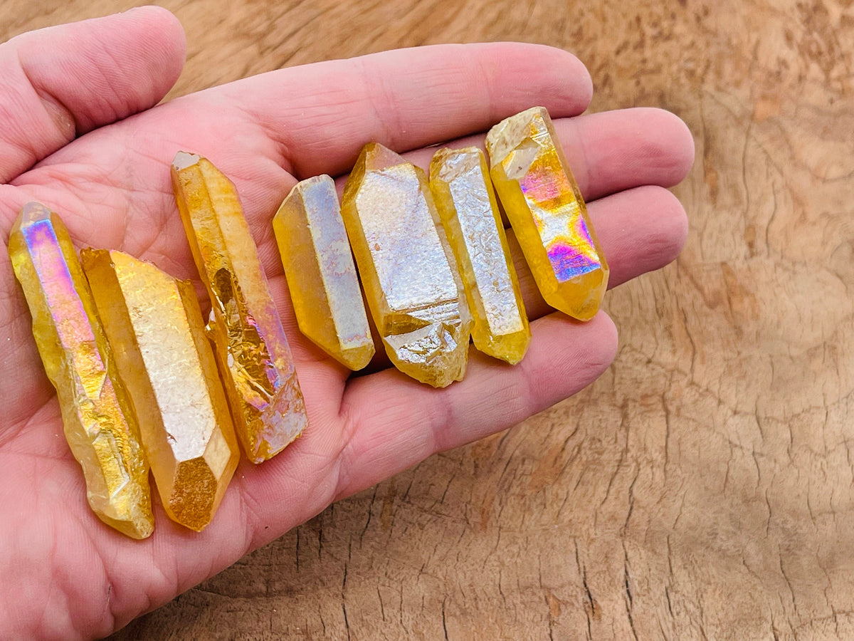 Unit price / perAura Quartz is known as a stone of high vibration, positivity, and spiritual upliftment. It is natural quartz that has been bonded with precious metals (like gold, titanium, or platinum), giving it a rainbow-like glow and enhanced energetic qualities.
